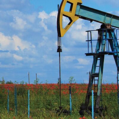An oil pumpjack operates in a grassy field with red wildflowers under a partly cloudy blue sky. A blue metal fence surrounds the pumpjack.