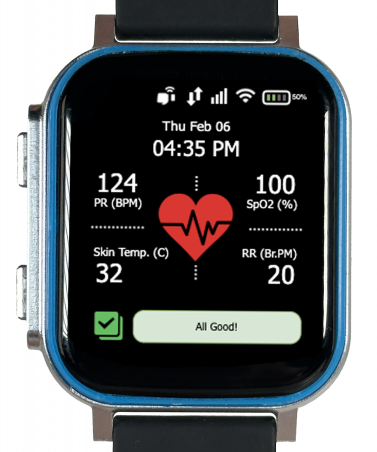 A smartwatch displaying health data, including heart rate (124 BPM), blood oxygen (100% SpO2), skin temperature (32°C), and respiration rate (20 breaths/min), with a heart icon and "All Good!" message on the screen.