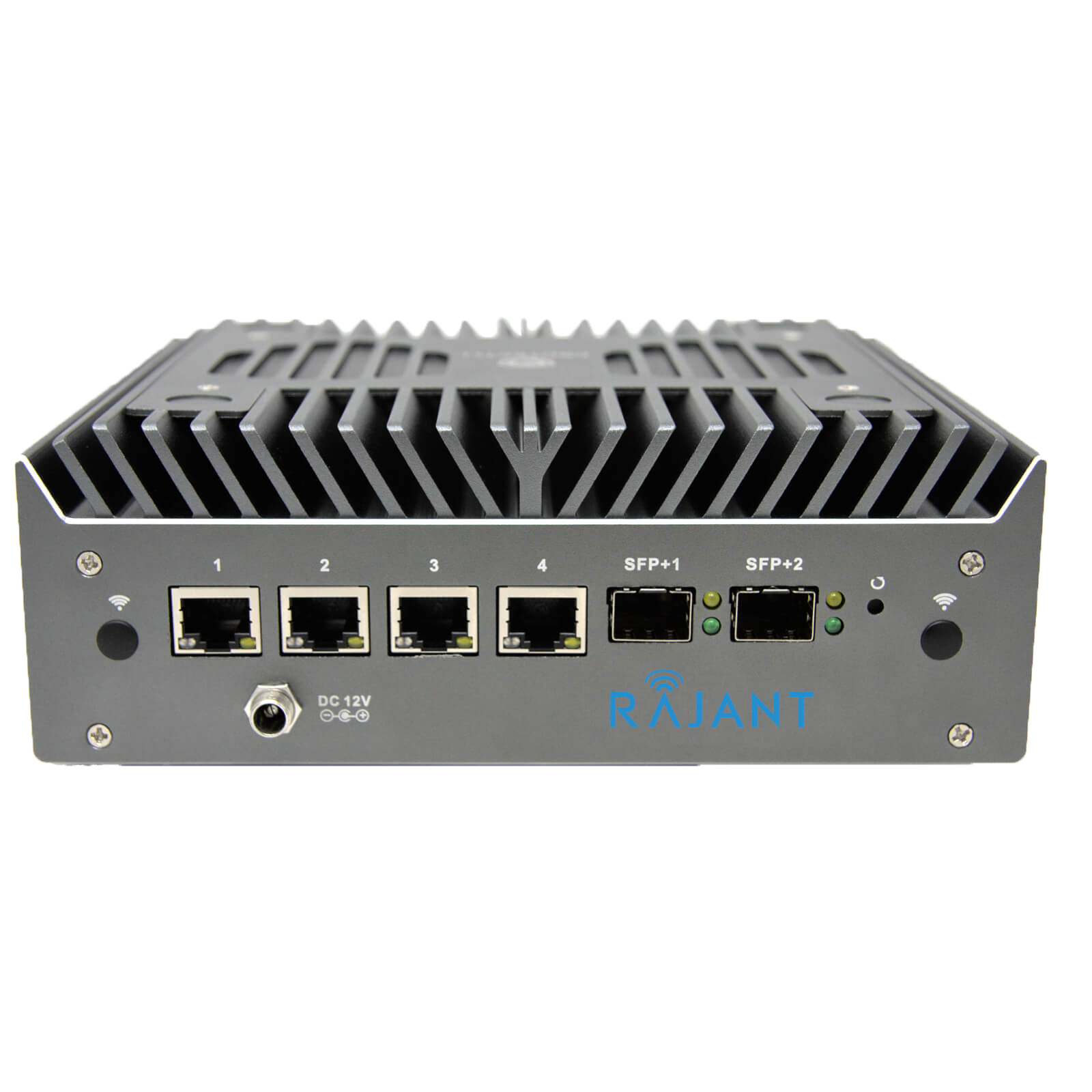 A Rajant network device with four Ethernet ports, two SFP ports, indicator lights, a DC 12V power input, and ventilation fins on top, all set against a white background.
