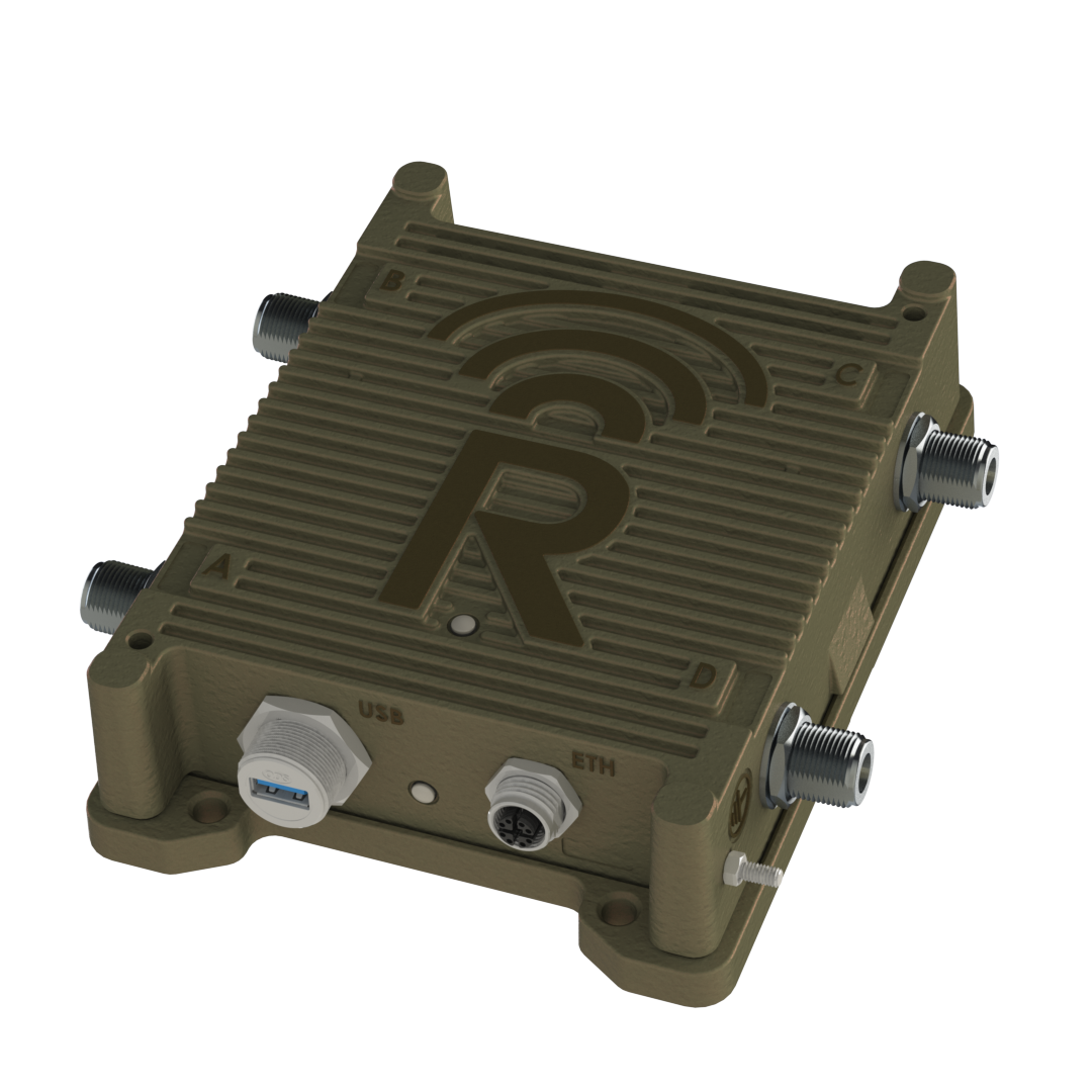 A rugged, olive-green electronic device with ribbed casing, labeled with a large "R" and wireless signal icon on top. It has multiple ports, including USB and Ethernet, and four corner mounting points.