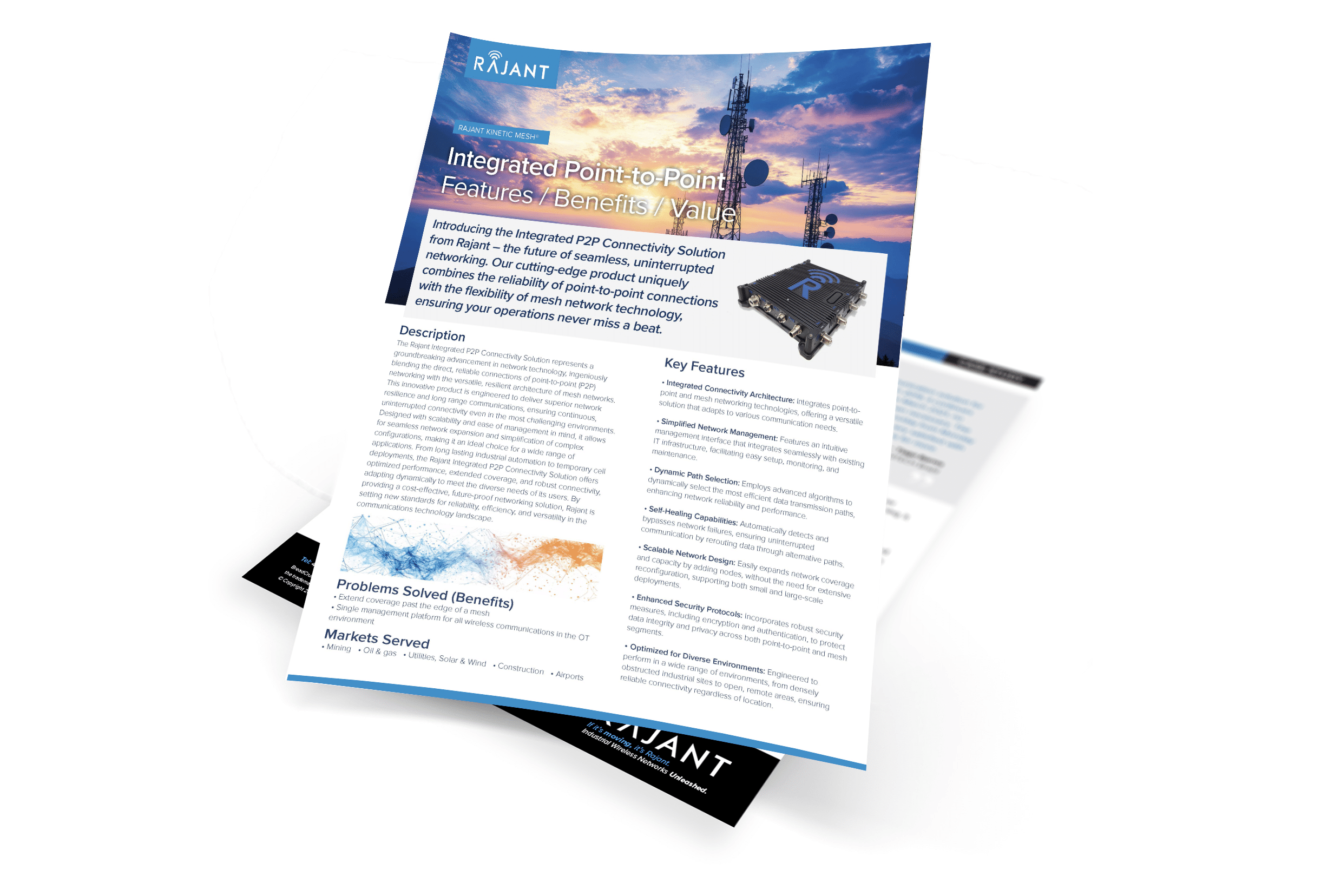 Introducing the Integrated P2P Connectivity Solution from Rajant – the future of seamless, uninterrupted networking. Our cutting-edge product uniquely combines the reliability of point-to-point connections with the flexibility of mesh network technology, ensuring your operations never miss a beat.